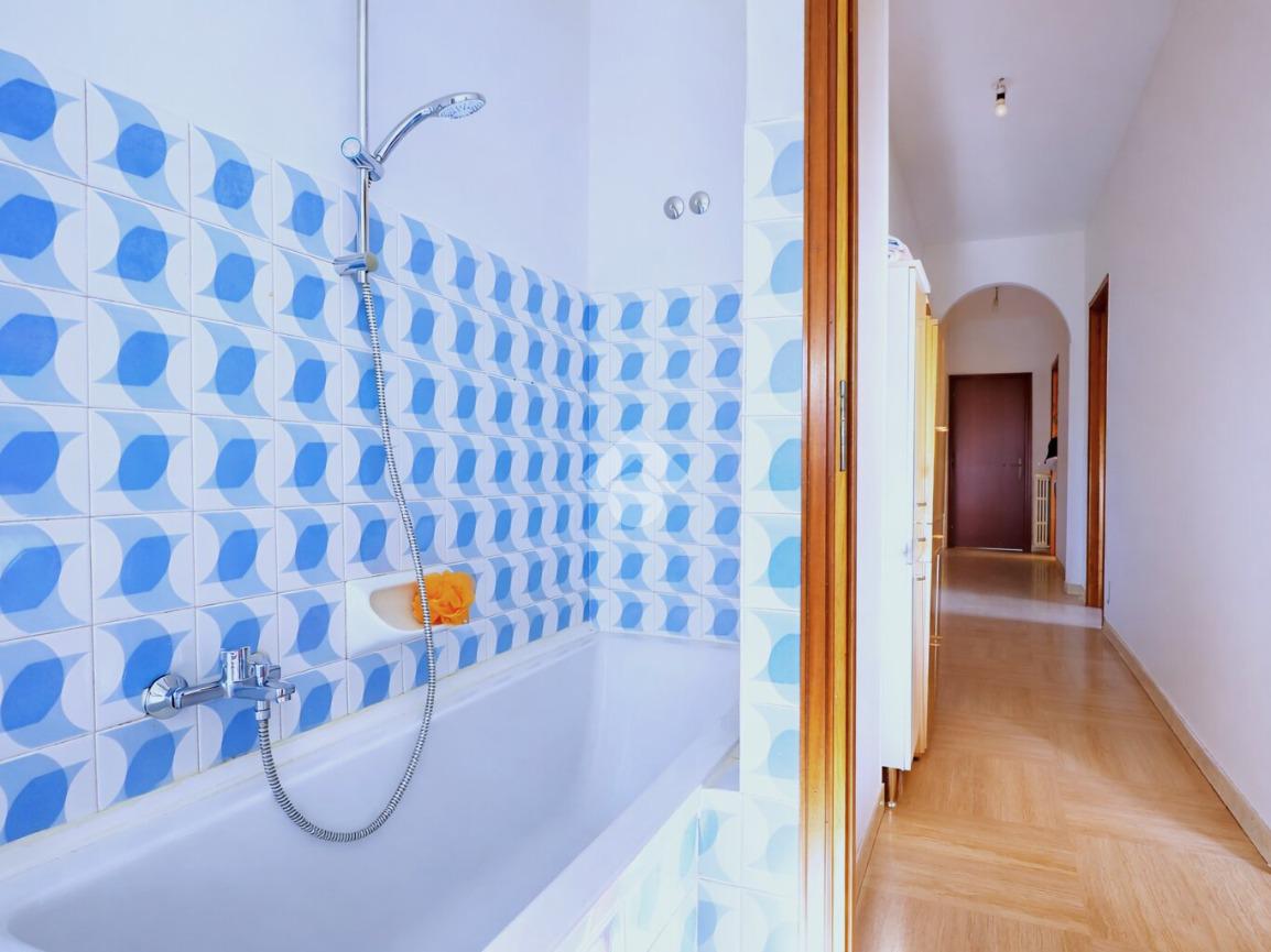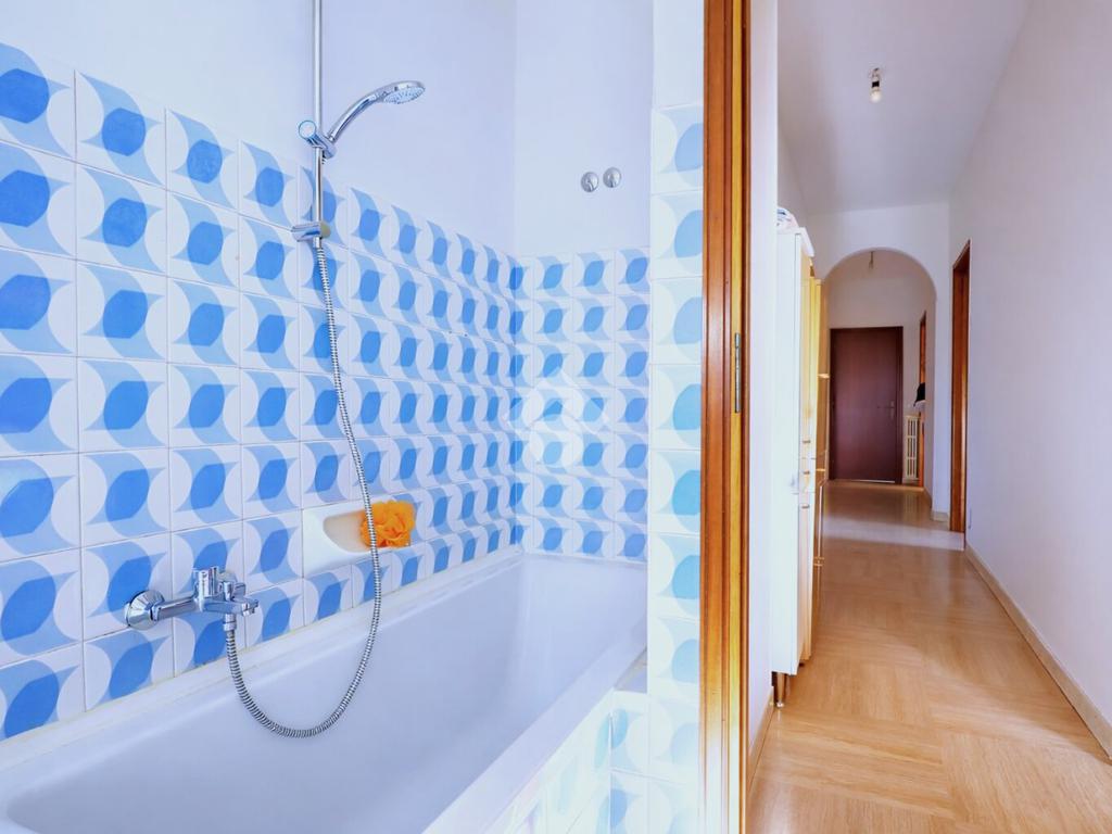Il bagno è finestrato e completo di vasca. L’appartamento è dotato di infissi in vetro singolo e riscaldamento tramite stufa.